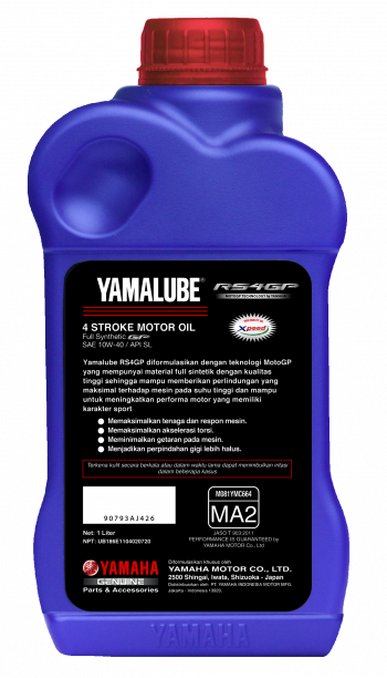 Yamalube RS4GP diformulasikan khusus untuk perawatan mesin motor 4-Tak premium Yamaha dengan teknologi MotoGP Yamaha untuk memenuhi kebutuhan pengguna Motosport Yamaha mulai dari penggunaan harian hingga penggunaan balap.